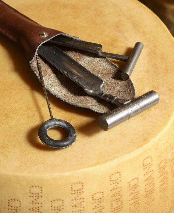 Oggi, il lavoro del battitore di Parmigiano Reggiano è cambiato ben poco rispetto al passato. Nonostante i progressi tecnologici, la battitura rimane un processo manuale che si basa sull’abilità sensoriale dell’artigiano. Il battitore utilizza un martelletto speciale per percuotere la superficie del formaggio. Dal suono che ne deriva, è in grado di valutare la consistenza interna e individuare eventuali vuoti o imperfezioni.